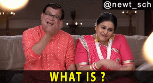 Hansa (Supriya Pathak) and a man from Khichdi react with the iconic 'What Is?' phrase, laughing on a couch.
