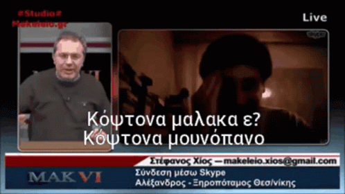 Stefanos Chios on a live broadcast, with harsh Greek insults displayed as captions.