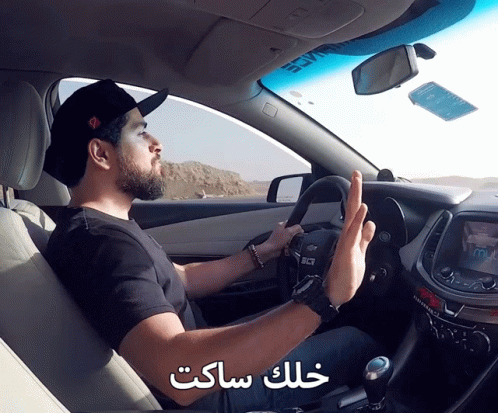 Man driving a car gestures for silence, with the Arabic caption 'Stay silent' displayed on screen.