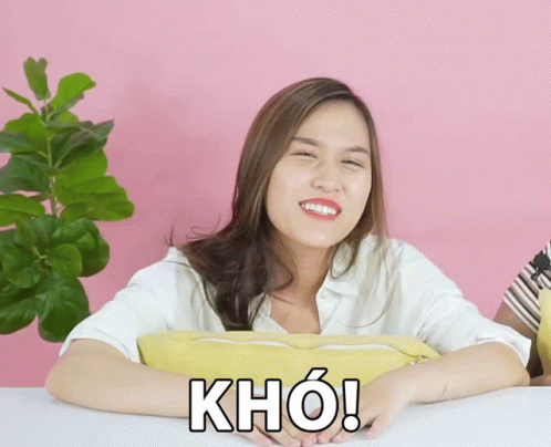 Quỳnh Chi reacts to something difficult, exclaiming 'Khó!' with a pained expression.