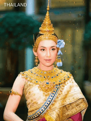 Bella Ranee in stunning traditional Thai Khon costume, adorned with golden jewelry and a Chada.