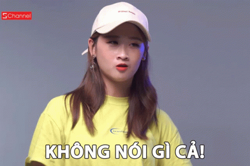 Tiểu Vi makes a "don't say anything" gesture, wearing a yellow shirt and white hat.