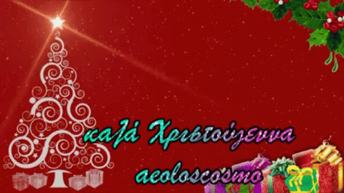 A festive Christmas card featuring a decorated Christmas tree, sparkling lights, and colorful presents.