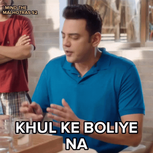 A man from Mind The Malhotras S2 says 'Khul Ke Boliye Na' (Speak openly) while gesturing at a table.