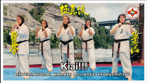 Women from International Karate Alliance Kyokushinryu perform a powerful Kiai during their karate practice.