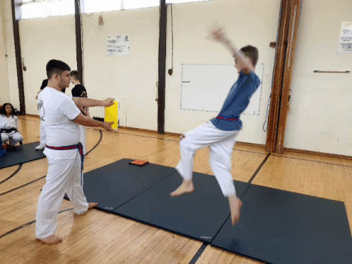 A young Taekwondo student practices a high kick with an instructor holding a target.