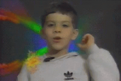 Young boy in an Adidas hoodie gives a thumbs up with a colorful 'COOL' graphic, reminiscent of 90s style.