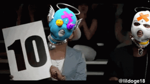 Kideight Gevols, masked figures, hold up signs displaying the number 10, indicating a perfect score.