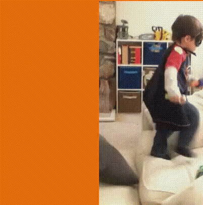 A child dressed as Robin plays with a toy, then hangs upside down from a ceiling beam.
