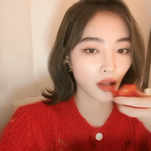 Kiki Xu Jiaqi enjoying a fresh strawberry while wearing a cozy red sweater.
