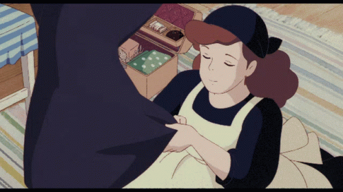 Kokiri from Kiki's Delivery Service diligently sews a dark garment while sitting on a striped rug.