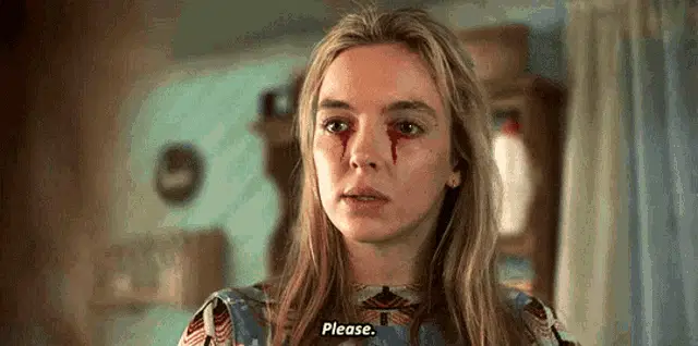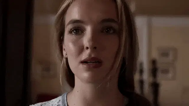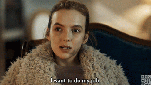 Jodie Comer as Villanelle in Killing Eve, stating her desire to do her job really well, wearing a fluffy coat.