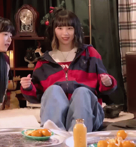 Kim Chaewon of LESSERAFIM smiles brightly and makes cute gestures in a striped jacket.