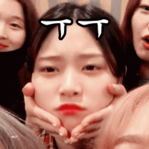 Loona member Kim Hyunjin pouting with a 'TT' emoticon sticker on her forehead, playfully held by friends.