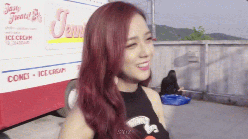 BLACKPINK's Kim Jisoo smiles and makes a heart sign with her hands in front of an ice cream truck.