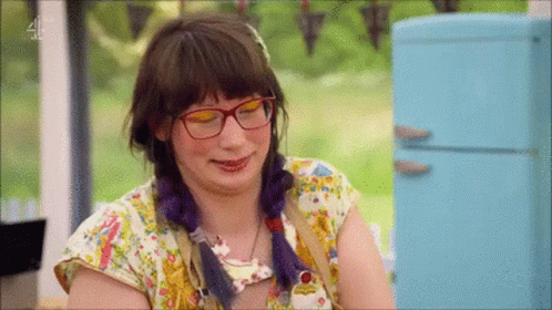 Kim-Joy from Great British Bake Off smiles sweetly, wearing glasses and purple-tipped braids.