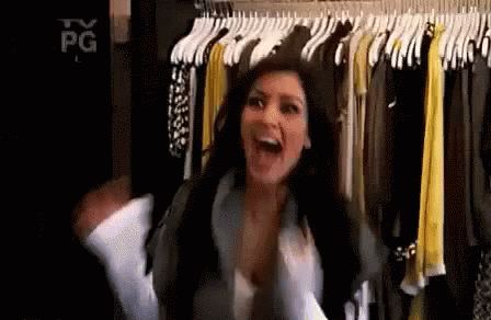 Kim Kardashian screaming ecstatically in a clothing store, surrounded by racks of clothes.