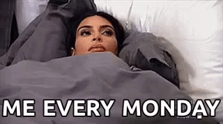 Kim Kardashian lies in bed under a blanket, looking tired, with the caption "Me Every Monday" reflecting a relatable mood.