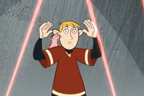 Ron Stoppable from Kim Possible, with Rufus on his shoulder, raises his hands in a surprised reaction.