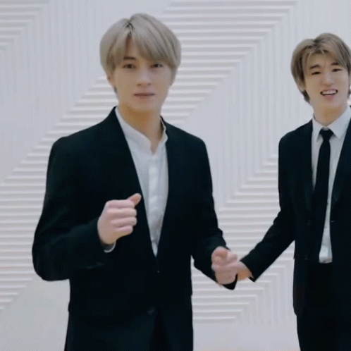 Kim Sangwoo in a black suit and white shirt, making hand gestures with a smile.