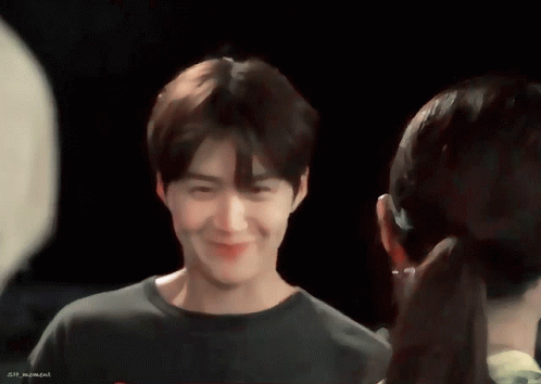 Kim Seon Ho smiles warmly, looking towards someone off-camera in a dark setting, wearing a black t-shirt.