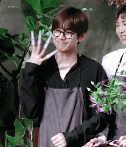 Kim Taehyung (BTS V) wearing glasses and an apron, playfully showing off his long, decorative nails.