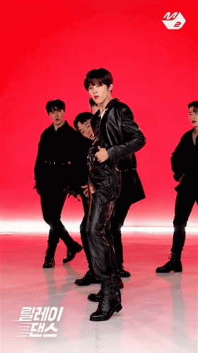 Kim Wooseok performs his 'Red Moon' relay dance, showcasing powerful moves with backup dancers against a red background.