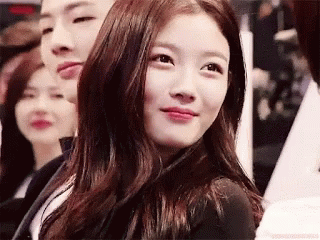 Actress Kim Yoo Jung smiles brightly, looking up and to the side in a crowd.