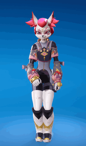 a cartoon character with pink hair and a sword is standing in front of a blue background