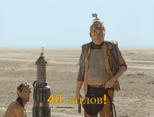 A scene from Kin-Dza-Dza! with a man in a desert, displaying '40 chatls!' on screen.
