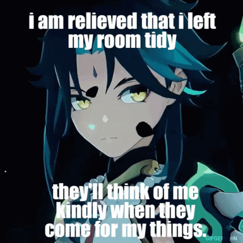 Genshin Impact character Xiao with a meme about leaving his room tidy.