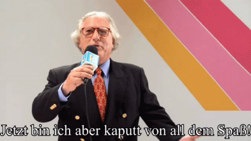 A man speaks into a microphone, exclaiming in German: 'Now I'm tired from all the fun!'