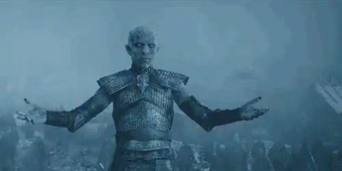 The Night King from Game of Thrones stands with arms outstretched, raising his army of the dead.