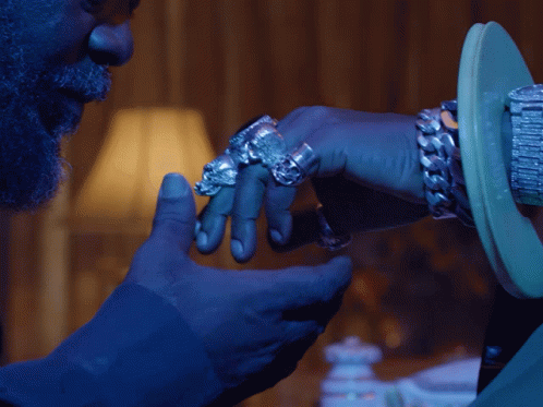 A man kisses the hand of another adorned with rings, a gesture of respect or submission from King of Boys: Return of the King.
