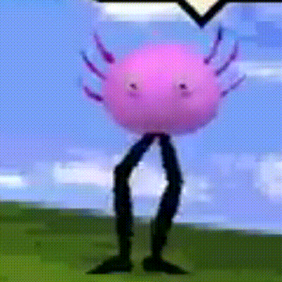 A pink Kinitopet character with long legs dances in a pixelated field under a blue sky.