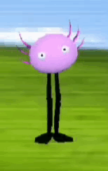 A pink Kinitopet creature with long black legs stands in a green field, twitching its eyes.