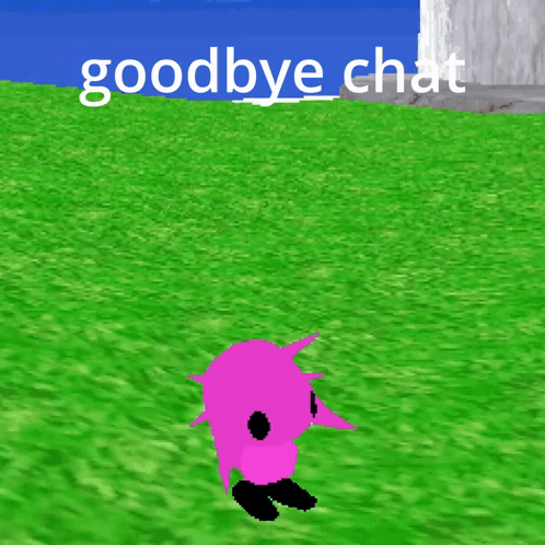 A pink Kinitopet-like creature says 'goodbye chat' before disappearing into the ocean in a simple 3D world.