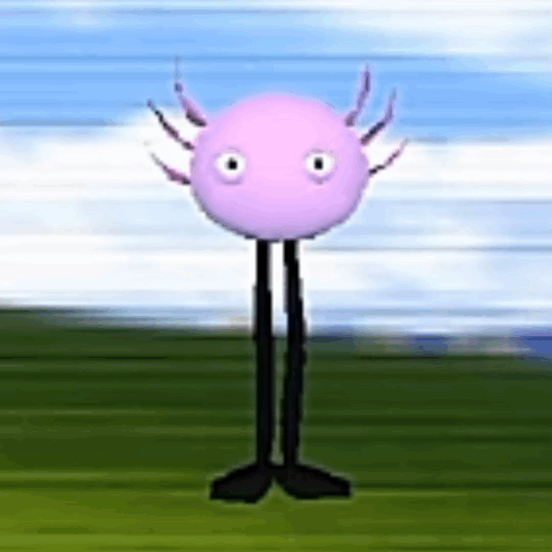 Kinitopet Kinitotheaxolotl, a pink axolotl with long legs, briefly dons a top hat and cane in a grassy field.