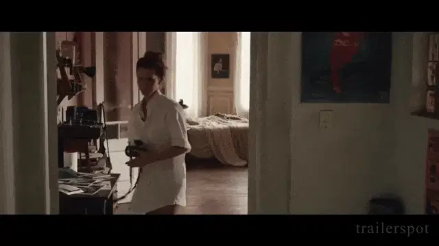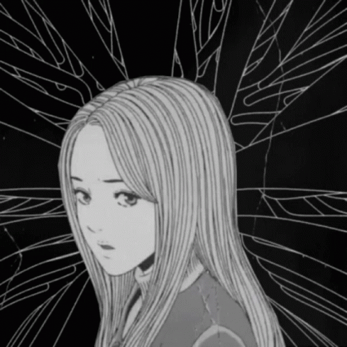 A black and white animated drawing of a sad girl with long hair and a tear, set against a cracked background.