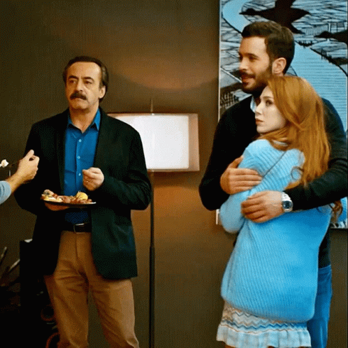 Elçin Sangu and Barış Arduç from Kiralik Ask share a hug, as a man with a mustache watches.
