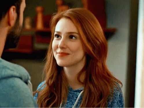 Elçin Sangu, known for Kiralik Ask, smiles warmly while looking at a man, showcasing her vibrant red hair.