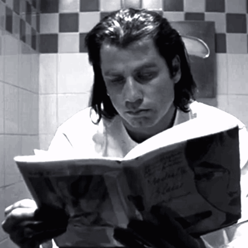 Kirillanchisk Sigma in a classic Pulp Fiction scene, reading a book on the toilet in a checkered bathroom.