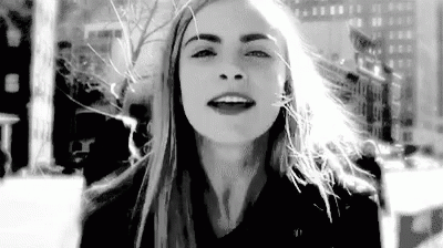 Cara Delevingne blows a kiss to the camera in a stylish black and white outdoor shot.