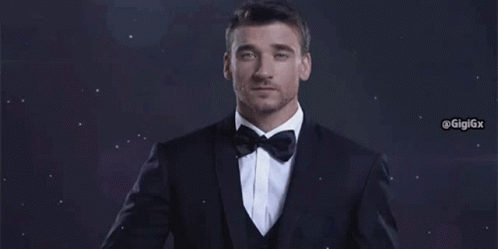 Damiano Carrara, dressed in a tuxedo, blows a kiss to the camera with sparkling effects.