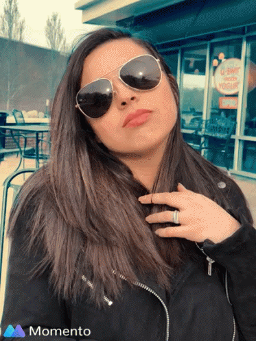 Kat, a woman in sunglasses and a black jacket, with the word 'momento' visible.