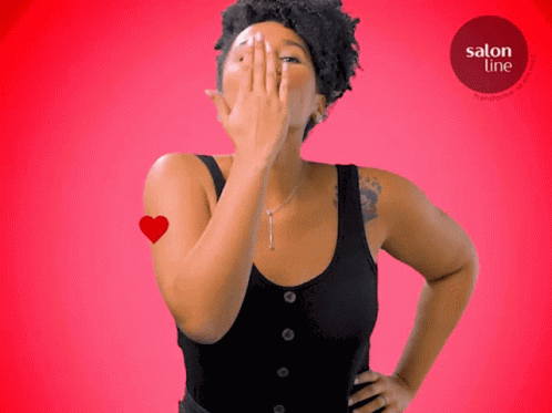 Mona Nunes blows kisses to the camera, surrounded by red hearts, with a Salon Line logo in the background.