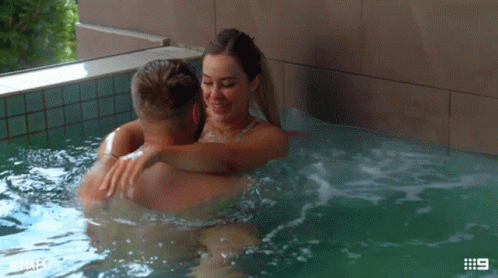 A couple from Married At First Sight shares a passionate kiss while embracing in a hot tub.