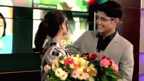 Kira and Grae share a sweet moment, with a man holding a bouquet and a woman smiling in a face shield.