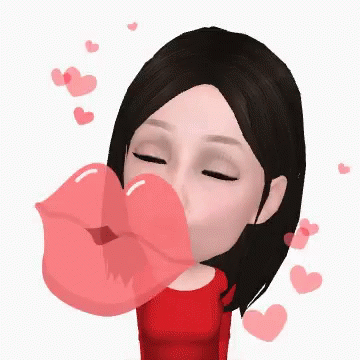 A cute animated character in a red shirt blows a kiss, surrounded by floating pink hearts.