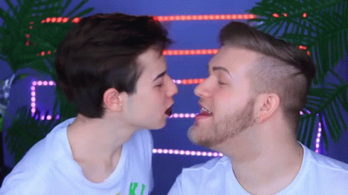 Clawdeena and another man share a passionate kiss in front of a vibrant, neon-lit background.
